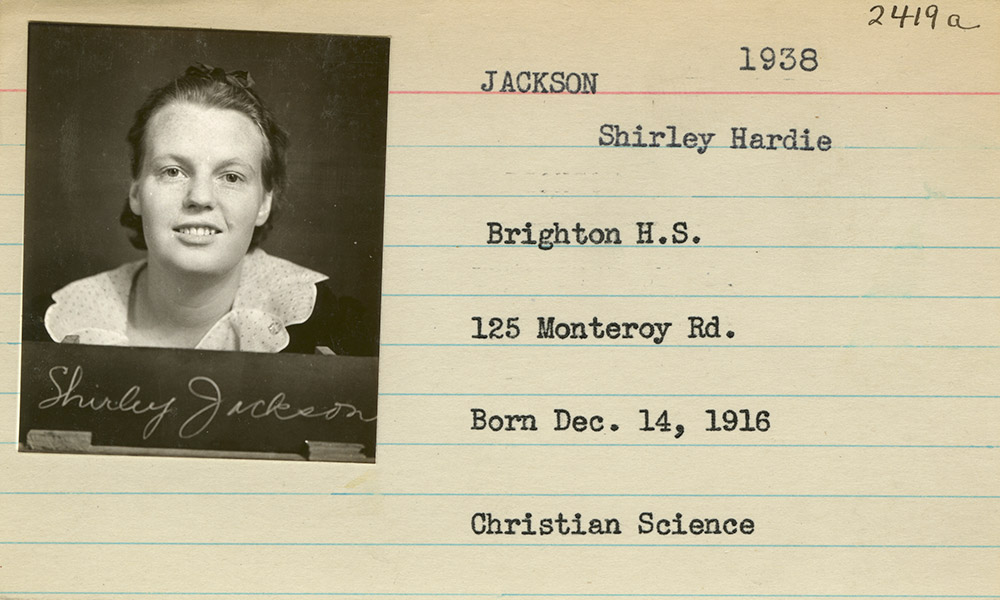 Jackson matriculated at the University of Rochester (here is her pretty cute student ID card), and would have been part of the class of 1938 had she not dropped out after her sophomore year. Or, I suppose “dropped out” isn’t exactly the right term—her grades were so bad that year that at the end of it she was asked to leave. In her biography of Jackson, Ruth Franklin notes that the writer later commented that she had been kicked out “because I refused to go to any classes because I hated them.” She spent the next year writing, forcing herself to produce at least a thousand words a day, and when she applied to Syracuse University she did so with the goal of making writing her career. She matriculated there in September 1937, quickly found her feet, began publishing her work, and graduated in 1940.
