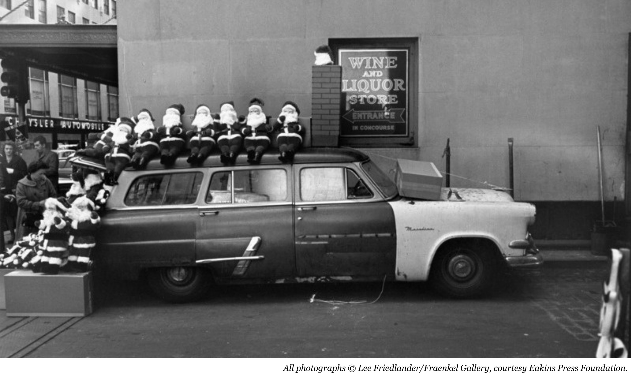 Santa Claus, the mythic figure who brings gifts late at night on Christmas Eve, is thought to be the patron saint of children. He might have a sleigh, reindeer, elves. He might know when you’re asleep and when you wake, when you’re good and when you’re bad—and he might actually keep tabs. In the case of Lee Friedlander, he might simply know what you look like, and his gift may not be any more complicated than sharing that with you in photographs made over a lifetime.