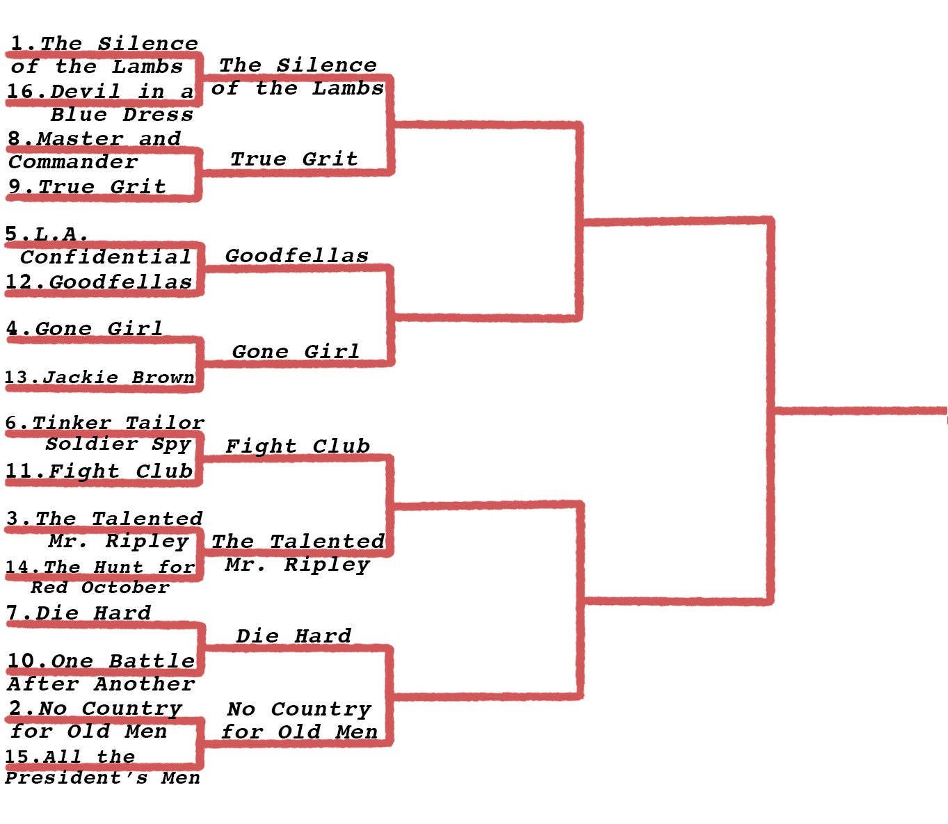 There are a couple of other movies that went far in my personal bracket that didn’t survive the first round of voting: Stalker, Tinker Tailor Soldier Spy, and Master and Commander. Pour one out for the type of film guy who is “all in on physical media these days.”