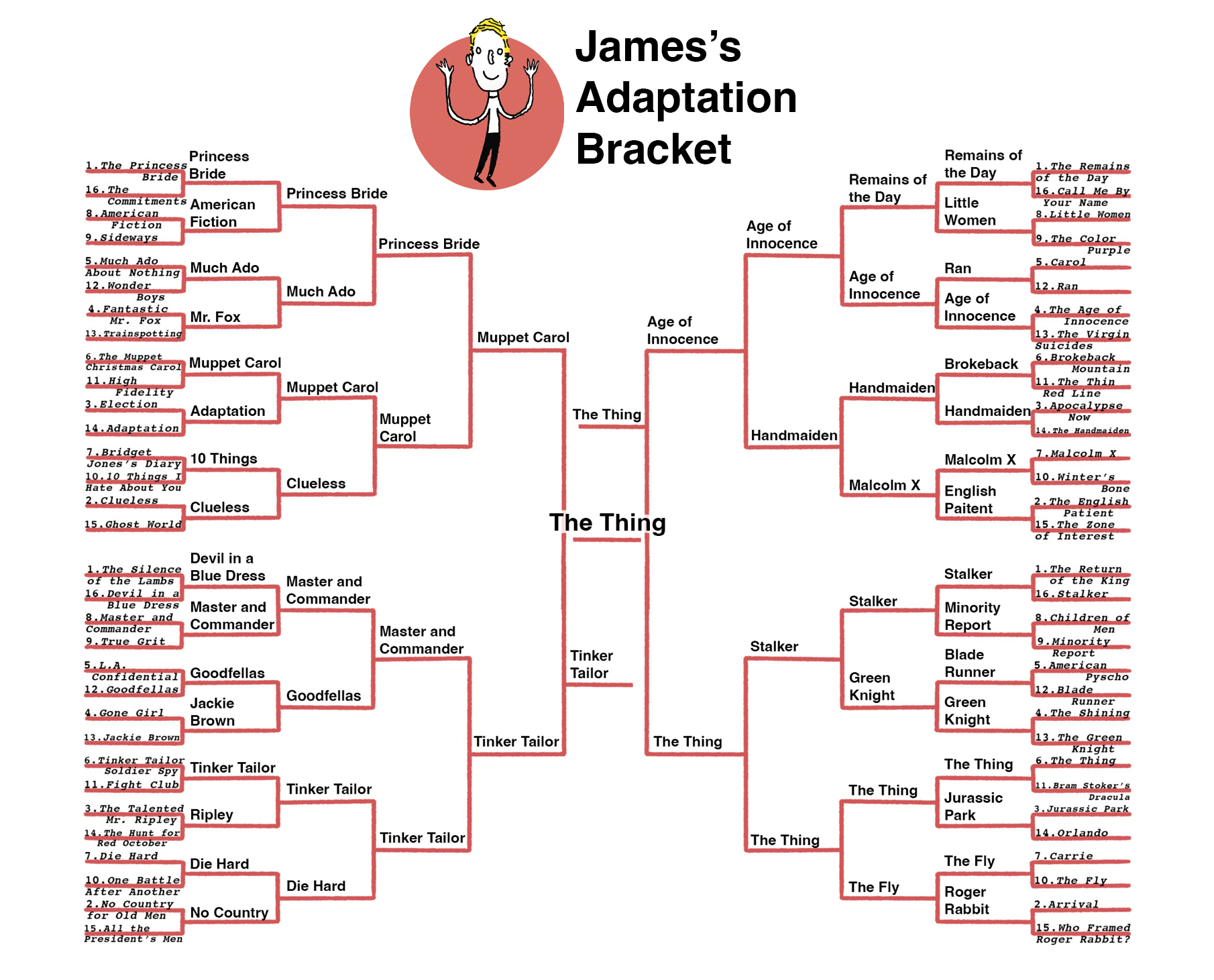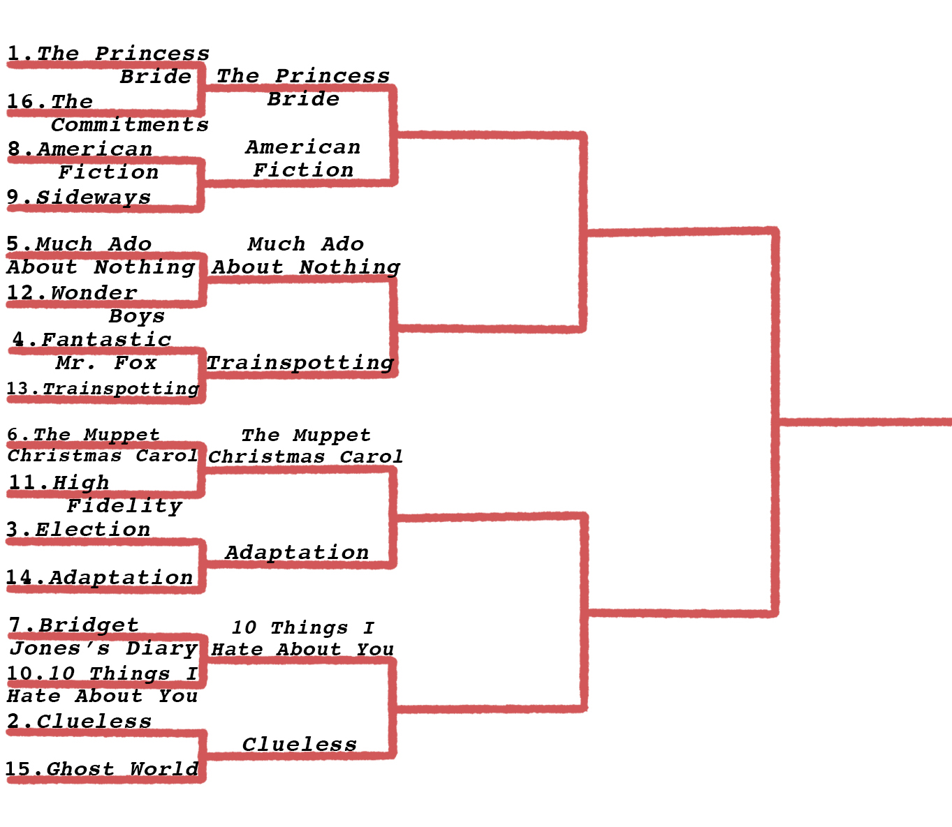 Overall, there weren’t a lot of blow outs yesterday, and more than a few very close races: Muppet Christmas Carol barely beat High Fidelity (a victory of Millennial nostalgia over Gen X nostalgia, perhaps?) and Age of Innocence squeaked by The Virgin Suicides. Scorsese’s two for two so far in our bracket.