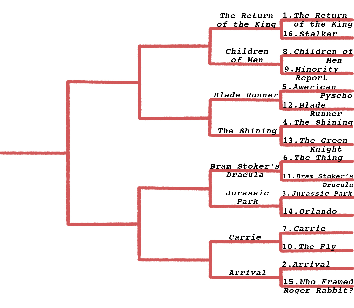 Over in Drama, Brokeback Mountain vs. Apocalypse Now is a strange pairing, and one that might reveal something about our readership. But the wackiest quadrant by far is Sci-Fi, Fantasy, and Horror, which has immediately gotten very chaotic—nearly every matchup here is impossible for me to predict.