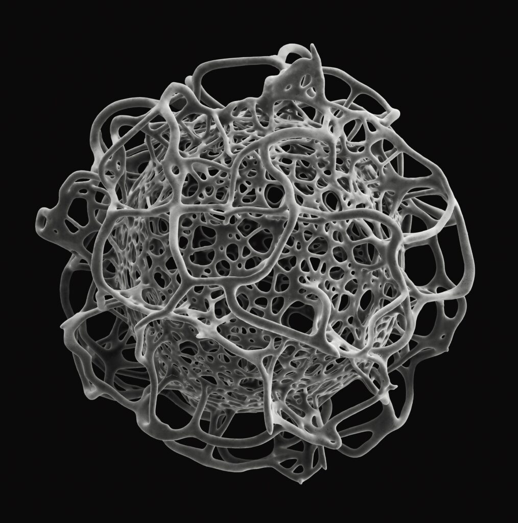 Radiolarian skeletons are typically constructed of an orderly mesh of rigid polygons. These are frequently shaped into nested spheres—though there are many exceptions, including intricate axial symmetries. The central sphere contains the cell’s endoplasm and nucleus, site of the greatest cellular activity. Surrounding that and protected by an outer shell is the cytoplasm, a frothy liquid of protein-synthesizing ribosomes, energy-producing mitochondria, energy-storing lipids, and the like.