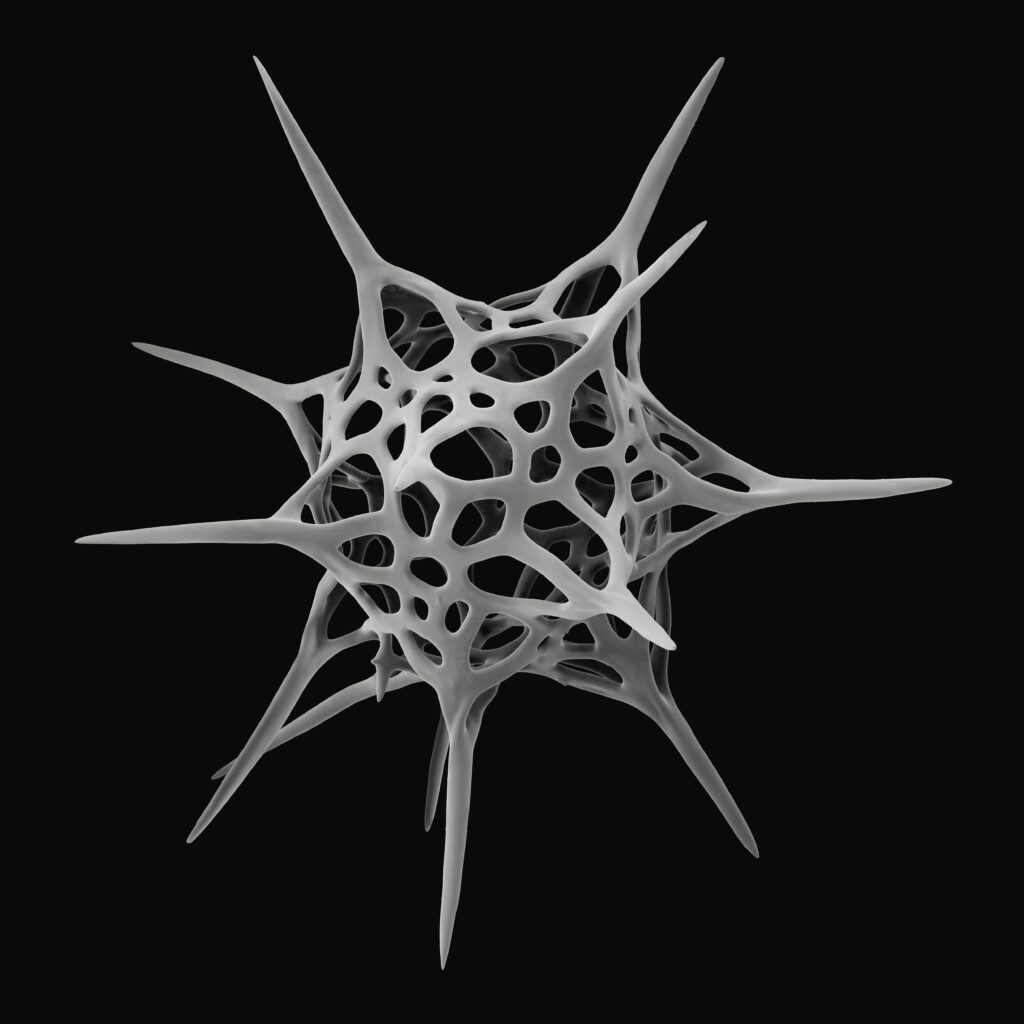 Radiolarians are adept at distilling silica, a form of quartz, from seawater, a process known as biomineralization. In this process, they generate a kind of mad geometer’s vocabulary of forms—polyhedra, Archimedean solids, icosahedrons, dodecahedrons, and the like—tongue-twisting shapes perforated by radiating spines and microtubules. Their extraordinary morphologies serve to refute any suggestion that biological forms must simplify as they grow smaller.