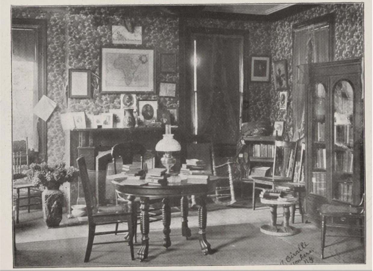 But at long last, a recently-resurfaced photograph has provided us with a more detailed look into the world of these early Black bibliophiles—a world at once elegantly studious and defiantly oppositional. Upon first glance, the room looks like a typical parlor of its era, clinging to the vestiges of late Victorian décor that were quickly fading from fashion. Note, for example, the heavy draperies and their tassels, the busy floral wallpapers, the stalks of hydrangeas that flank the mantelpiece, and the art and finery covering every surface.