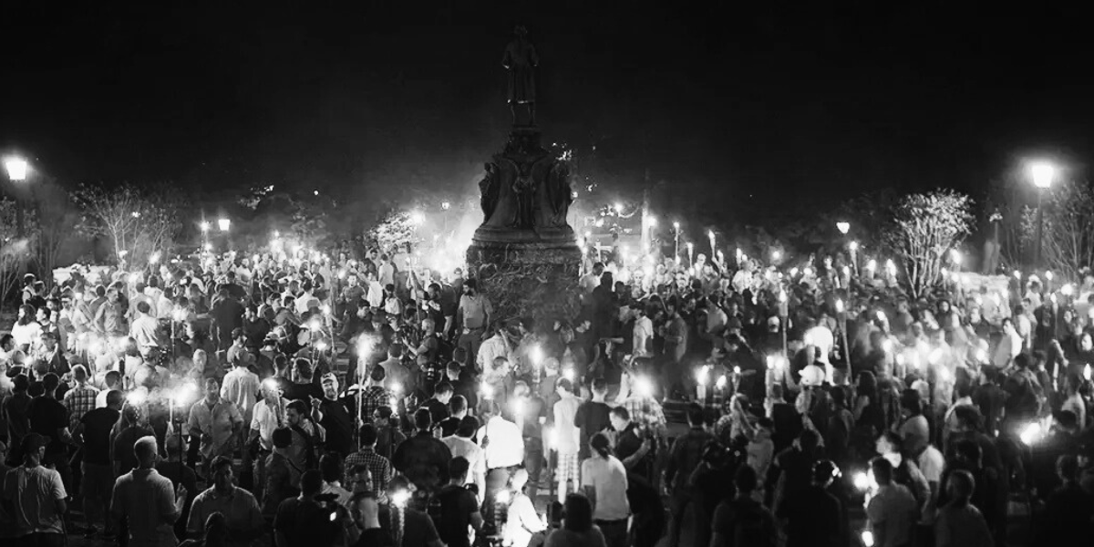 Two centuries later, on the evening of August 11, 2017, hundreds of White men in khakis held tiki torches as they marched on UVA’s lawn toward the Rotunda. They were marching against Charlottesville’s plans to remove a statue of Robert E. Lee, the Confederate general who battled to maintain the enslavement of Black people during the U.S. Civil War.