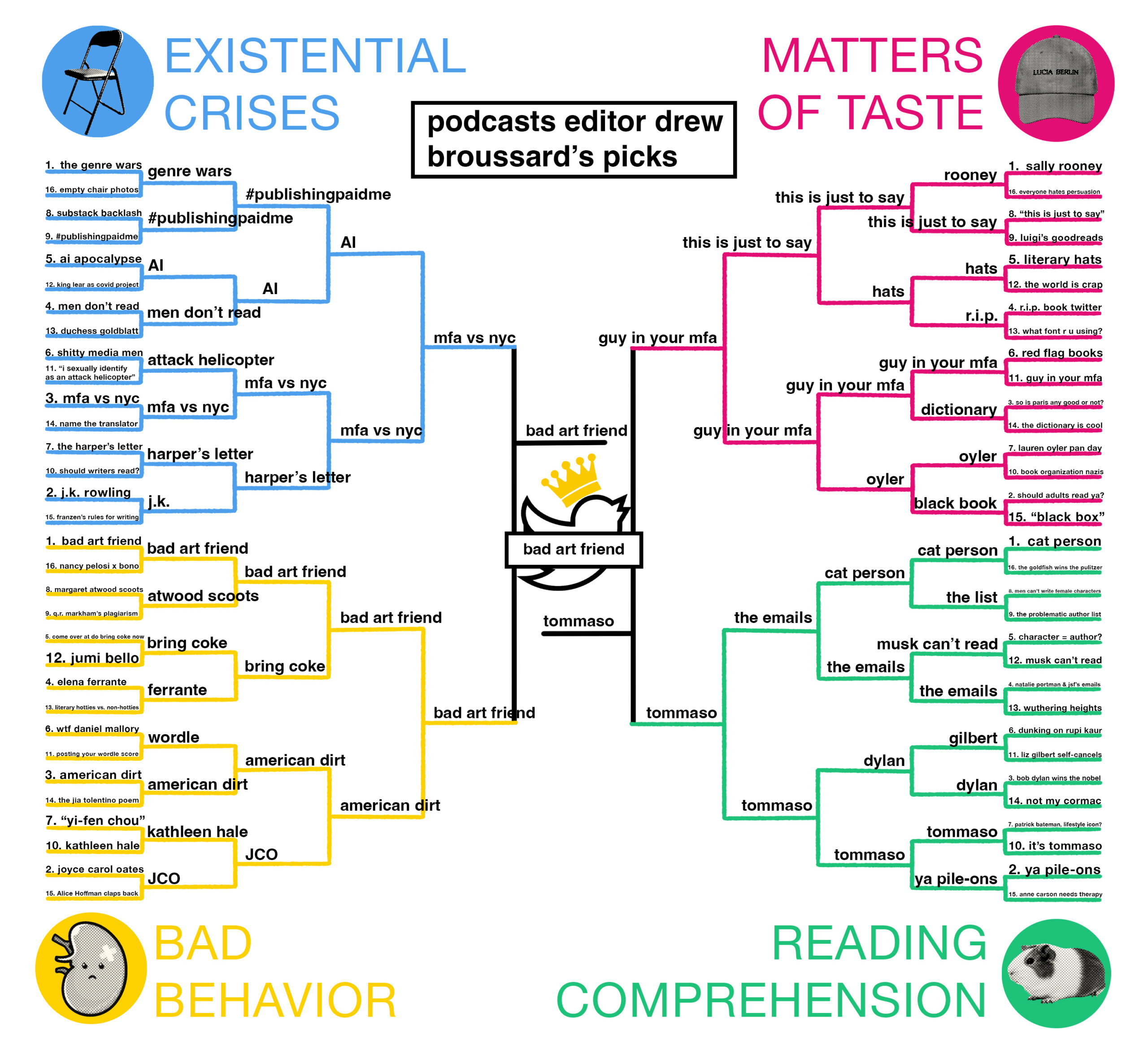 And here’s Drew’s complete bracket, where the “bring coke” Tweet goes far, but can’t edge out bad art friend: