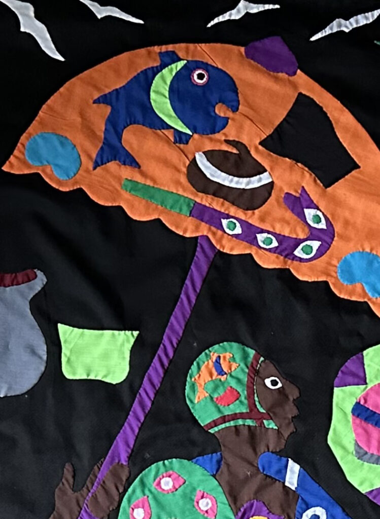 But these techniques come with their own histories. In illustrating through hand stitched appliqué, I draw on both American and Dahomean traditions. The choice of materials and techniques thus resonate in two zones. I appreciate Deena’s point that “African stories have been told visually for millennia, and visual storytelling is a fundamental part of human expression.” In West Africa, specifically in the Kingdom of Dahomey, visual storytelling was expressed for centuries through fabric (since at least back to the reign of King Agadja, 1711-1740). It was used, for example, in the form of banners to honor the gods, to commemorate success in battle, to threaten an enemy, and to sing the praises of a king. [See detail from contemporary appliqué by Yémandjè in which both umbrella and king’s hat reference a praise name story of King Houegbadja (1645-1685) regarding the fish that recognizes the net].