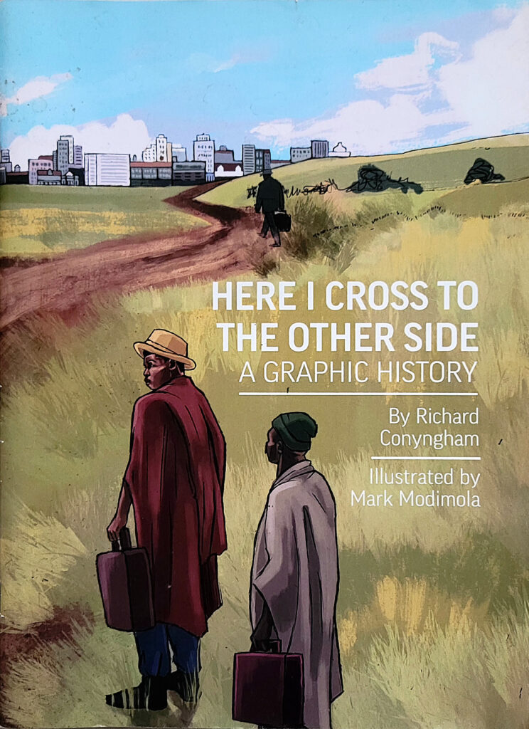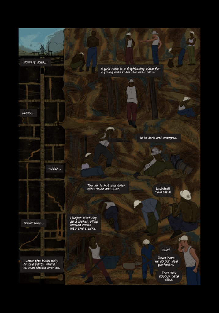 In the graphic novel, Here I Cross to the Other Side, part of the All Rises series I worked on with Richard Conyngham, we tell the story of miners during South African apartheid. There’s a scene where the miners are all working underground. Here the text on its own is compelling, with descriptions of a gold mine. The panels here are set up in a similar way to hieroglyphics, where the panels merge into the tunnels in a pace that echoes drum beats or machine knocking. What inspired the layout for me was the language used in the mines, the machines of industry in the recollection of miners and rhythm of industry. With the image, we were able to better illustrate the “nature of the mine” and the description of it being the “black belly of the earth,” a phrase that, together with the phrase “Layisha!! Tshetsha” (load-up, hurry-up), illustrate the experience of mining across all cultures.