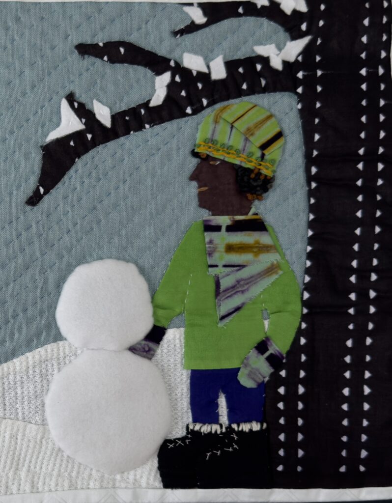 Lisa Maria Burgess: Some African storytelling has been doing the important work of reflecting the lived experiences of Africans on the continent and abroad. I have not walked door to door and taken a census, but I’m quite sure that Africans are living in every country. Visual storytelling can reveal this reality, so we do not have to tell the stories that explain or justify this reality. In this sense, visual storytelling can open a horizon for every African story to be told. In my children’s picture books, the illustrations provide a landscape that is a stable background for the unknown narrative arc of the story. In telling a story of west African diaspora, the visuals of SnowPal Soccer/ Les copains de neige jouent au foot make the presence of an African child in a snowy North American landscape a given. The story does not need to answer the question of how this child dressed in West African fabric arrived in the snow. Because I use such textiles not only for the child’s clothes, but also for the squirrel and the tree and the rake and the shovel, because the visuals depict this reality, the story can, instead, answer the question of what happens when this child is creative and imagines a new world.