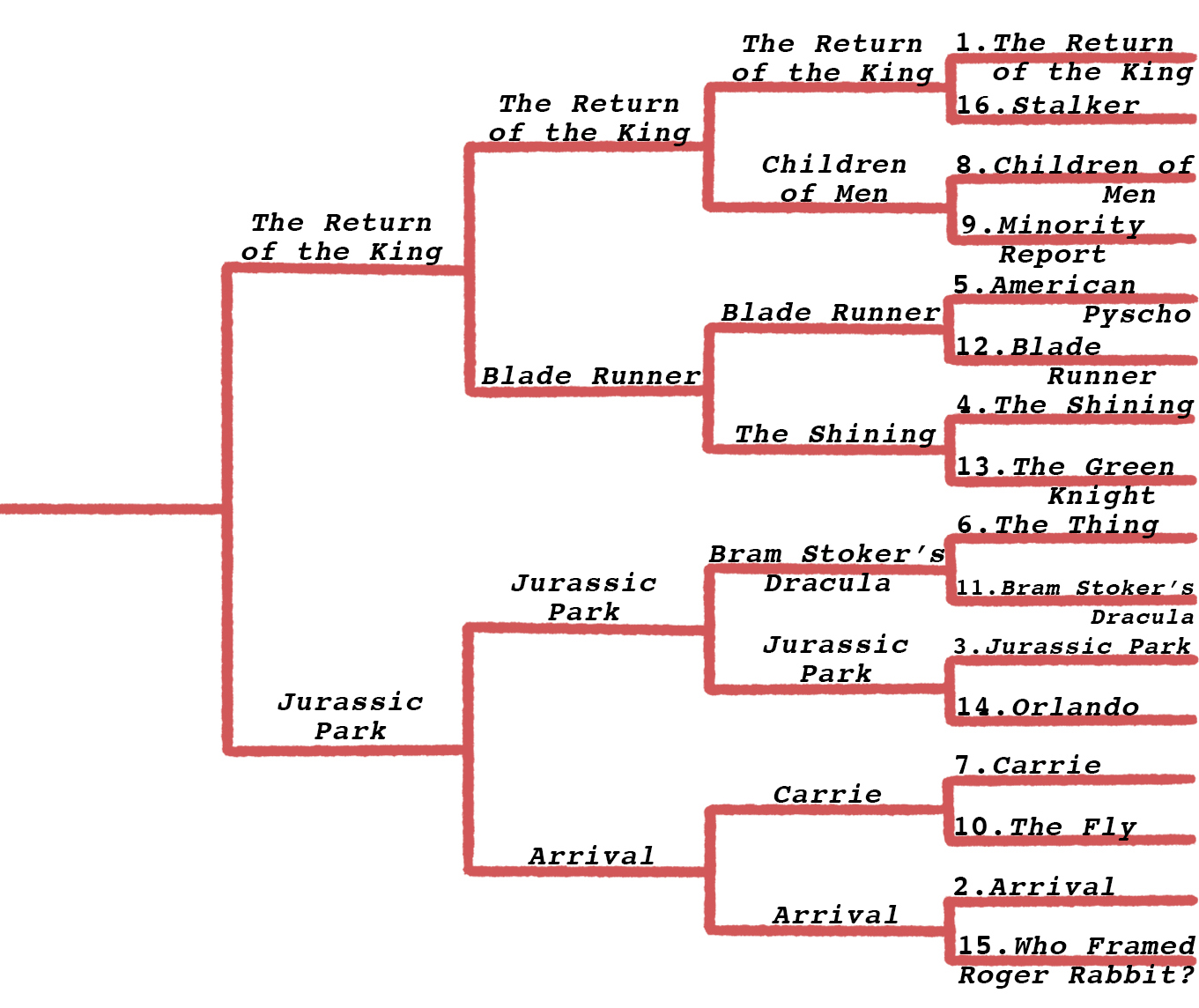 After tabulating yesterday’s results, we’ve arrived at the quarterfinals. The end of the bracket is shaping up to be just the hits, all killer and no filler. Each of our four top seeded movies is still in contention, and up against exclusively #2s and #3s. The underdogs put up a good fight though: The Talented Mr. Ripley, Blade Runner, and Arrival all came very close to making it to the next round.