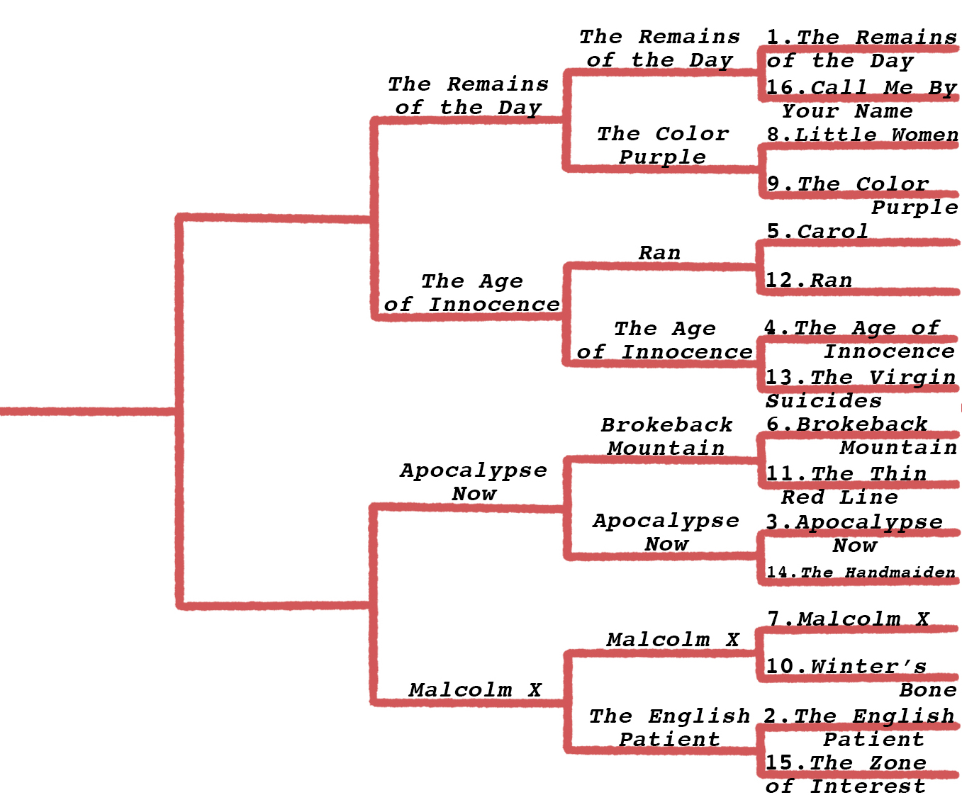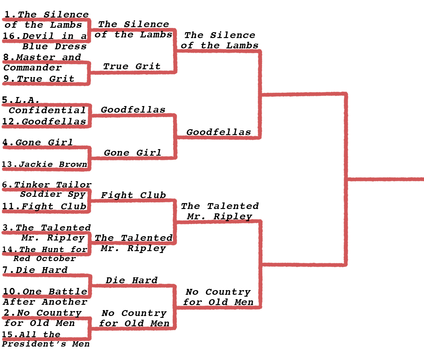 The SFF/Horror quadrant remains chaotic, featuring high fantasy versus hard sci-fi and dinosaurs versus aliens (otherwise known as the 10-year-old’s dilemma). And the Drama corner is very interesting this round, headlined by a big yearn-off between The Remains of the Day and The Age of Innocence. I’m still pulling for The Age of Innocence to make the finals, but The Remains of the Day might be the one to knock it out.