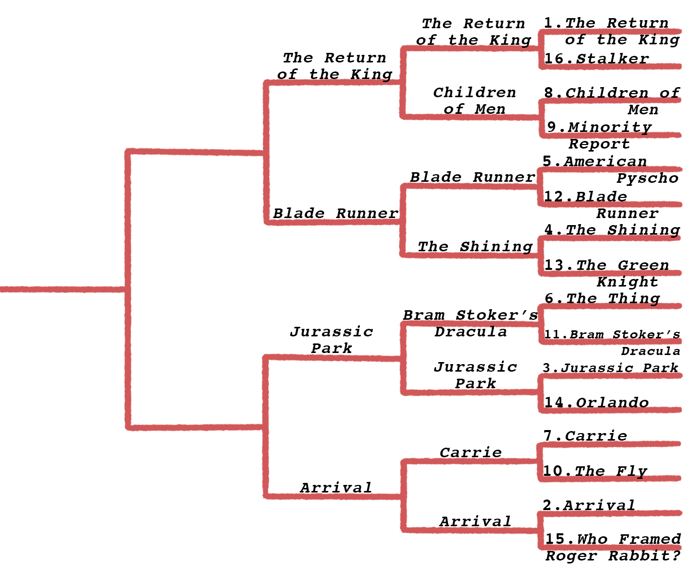A consolation is that yesterday’s final vote tallies were closer than I expected, and a few were very close: Trainspotting just barely lost to Much Ado About Nothing, and Blade Runner beat The Shining by a mere 5 votes.