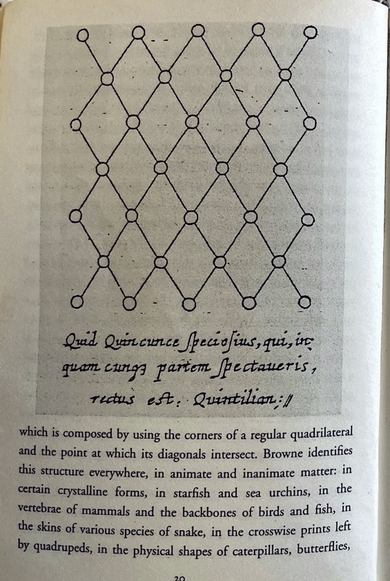 Early on, we see the “quincunx,” a lattice structure that the seventeenth-century author and natural philosopher Thomas Browne glimpsed “in the physical shapes of caterpillars, butterflies, silkworms […] the pyramids of Egypt and the mausoleum of Augustus.” It becomes clear, eventually, that this is a visual key to the quincunx structure of the book itself. Sebald encourages a state of reading where epiphany and paranoia are twinned. Suddenly, every image speaks to all the others: a wood scattered with dead bodies, fishermen shin-deep in a glut of herring, the author in front of a Lebanese cedar, accompanying a discussion of Dutch Elm Disease.