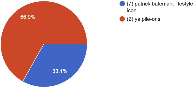 patrick bateman, lifestyle icon (7) vs. ya pile-ons (2)
