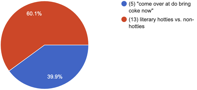 “come over at do bring coke now” (5) vs. literary hotties vs. non-hotties (13)