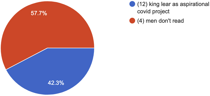 king lear as aspirational covid project (12) vs. men don’t read (4)