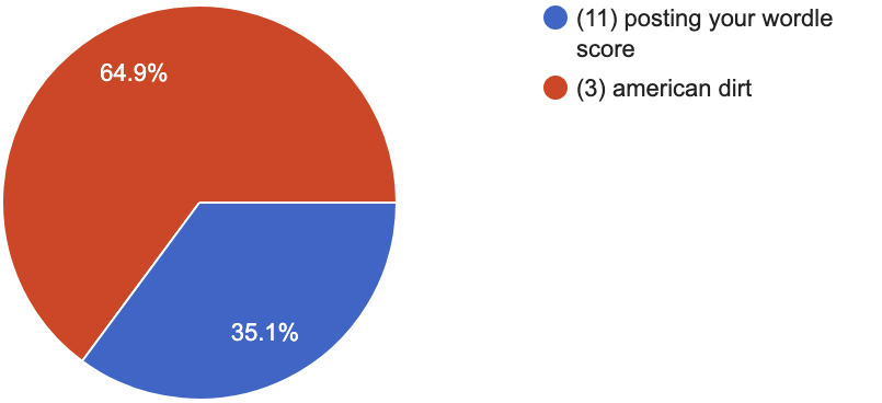 posting your wordle score (11) vs. american dirt (3)