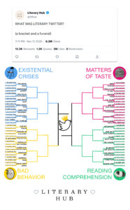 Now that Literary Twitter is dead, we’re asking, “What was it?” In this bracket, we’re seeking the Most Literary Twitter moment, discourse, or personage. What has been stuck in your mind, who sent you running to your group chat, what kept you scrolling for longer than you should have? What are you still bringing up in conversation today and having to explain to people with normal brains? In short, what most exemplified whatever the hell Literary Twitter was?