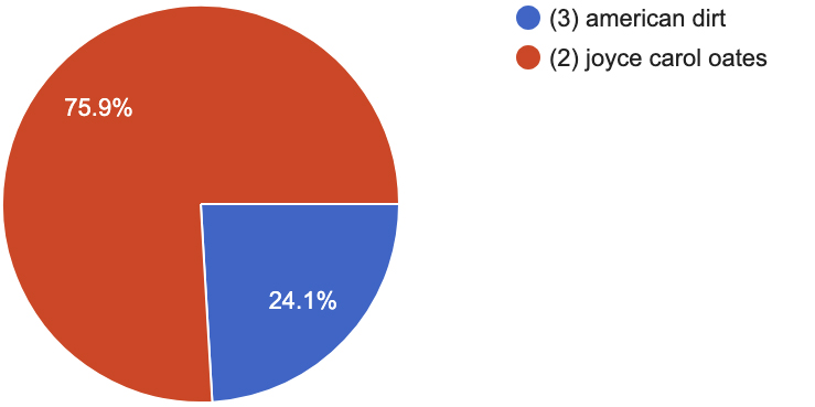 As always, Joyce Carol Oates continues to put up big numbers and I think she could really go far in the bracket. There’s a much tougher road ahead for the queen of microblogging though. If she can beat the American Dirt controversy today (and yes, of course, she did tweet about it), she’s going to have a real challenge against either bad art friend or “come over at do bring coke now,” two very strong competitors.