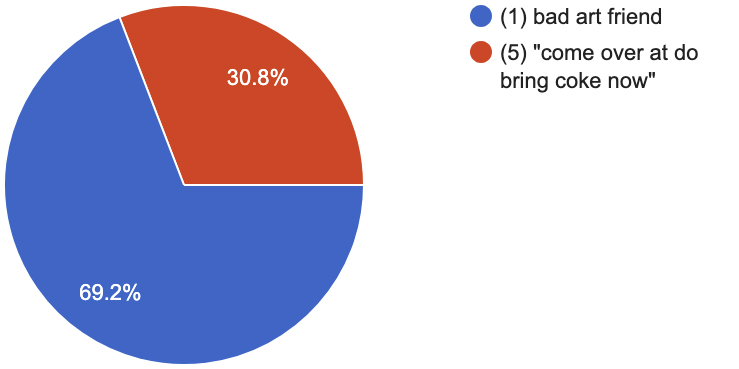 bad art friend (1) vs. “come over at do bring coke now” (5)