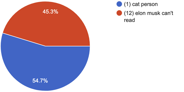 She’s not alone though. Cat person vs. Elon Musk can’t read is going to be a tight race and bad art friend, a Lit Twitter drama that broke containment, is up against “come over at do bring coke now,” a bizarre, only-on-Twitter moment. I think there are going to be some very close races today!