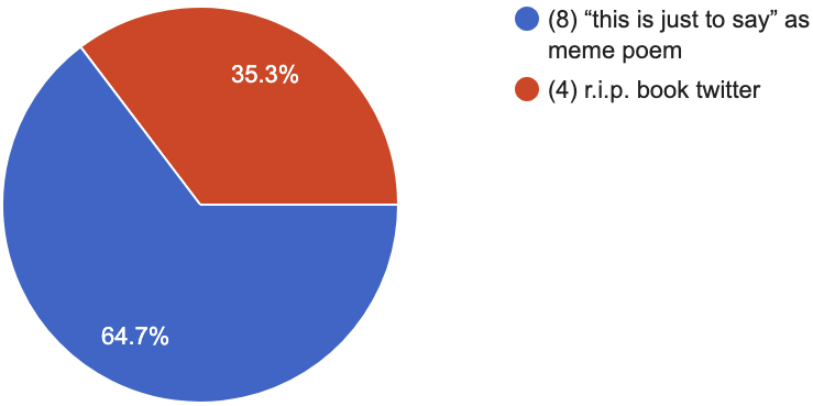 “this is just to say” as meme poem (8) vs. r.i.p. book twitter (4)