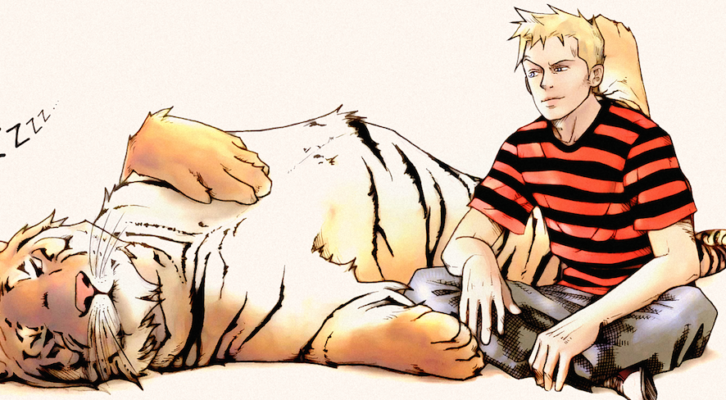 The strip follows Calvin, a blonde six-year-old American that Watterson named after the founder of Calvinism. Calvin’s first appearance was actually in a rejected strip from before Calvin and Hobbes called Critturs, in which he is the younger brother of the main character; the syndicate suggested he focus on this sibling instead, and that led to the creation of his flagship comic. Often, Calvin’s imagination represents a more exciting, more marvelous vision of the world around him; instead of listening in class to Miss Wormwood (herself named for C. S. Lewis’s apprentice devil in The Screwtape Letters), he may be dreaming of fleeing from aliens in other galaxies. An only child, Calvin’s best friend is a tiger named Hobbes, himself named for the author of Leviathan. To everyone but Calvin, Hobbes appears to be a stuffed tiger, while Hobbes is a real, talking tiger to Calvin. In Watterson’s words, Hobbes’s true nature is never fully defined by the strip, which is one of its beauties; Hobbes is a kind of ontological marvel, and yet utterly mundane all the same, for he is whatever he needs to be for whomever is perceiving him.